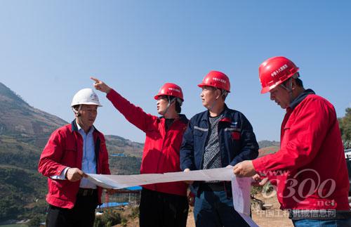 中铁十八局大瑞铁路指挥长闫树新(右二)、怒江特大桥项目经理于长彬(左二)等在施工现场研究施工方案。王会堂摄