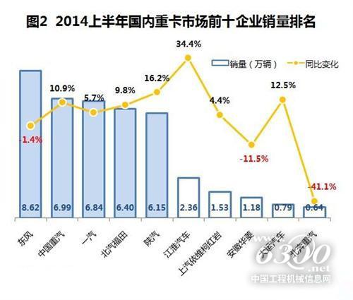 排位第六至第十的企业依次是江淮汽车、上汽依维柯红岩、安徽华菱、大运汽车和北奔重汽,其上半年销量均低于2.4万辆,与前五企业差距悬殊。其中,江淮汽车表现较好,销量同比增长34.4%至2.36万辆。大运汽车也有12.5%的增长,销量实现7945辆。