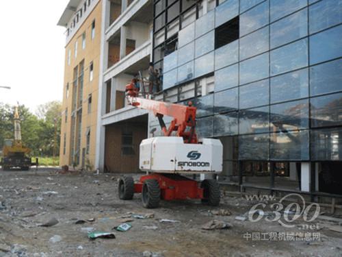工作人员使用高空作业平台对玻璃幕墙进行安装