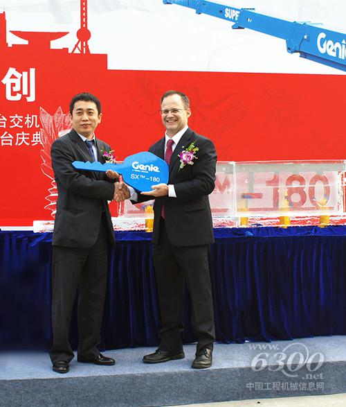 (11月10日,上海)站在毗邻外滩万国建筑博览群的一滴水码头,隔江相望陆家嘴现代建筑群,脚下似乎就是上海这个城市革新、突破的起点。而全球高空作业平台顶级品牌——吉尼与上海宏信设备工程有限公司(以下简称:宏信设备)就选择在此处举办Genie® SX™-180自行式直臂型高空作业平台交机仪式暨宏信设备拥有吉尼高空作业平台破千台庆典,这将是Genie® SX™-180迈进中国市场的起点,也将是吉尼与宏信设备共创蓝色宏图的一个重要里程碑。特雷克斯集团中国区总裁Ken Lousberg先生、特雷克斯高空作业平台部副总裁、大中国区销售与服务总经理James Barr先生、大中国区和外蒙古销售总监朱希明先生和远东宏信有限公司总裁助理兼上海宏信设备工程有限公司董事长王佳音先生、总经理章春雨先生和事业部总经理王一平先生受邀出席,共同见证吉尼家族中最高的自行式直臂型高空作业平台首次登陆中国市场;活动同时宣布,全国最大的高空作品平台租赁企业——宏信设备的吉尼高空作业平台拥有量亦突破一千台。