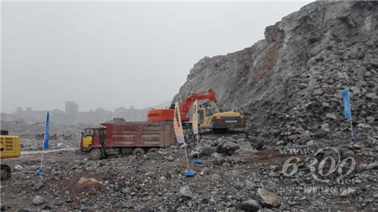 挖掘机到场的时候天空还下着瓢泼大雨,与客户约定的演示时间是上午10点,离演示时间越来越近了,雨还在下着,所有演示小组成员都在焦急的等待着雨停。天公作美,9点30分,雨渐渐的停了下来,巡演工作人员立即组织车辆准备演示。