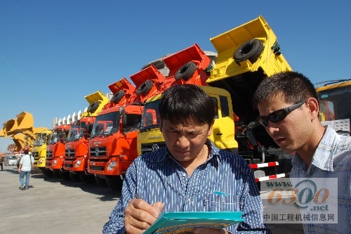 在霍尔果斯国际出口商品交易会上,一名哈萨克斯坦客商(左)在查看报表(9月12日摄)。 据霍尔果斯口岸管委会介绍,2007年前8个月经霍尔果斯口岸出口到中亚的各类工程机械、车辆比往年明显增多,总数超过1万台(辆),相当于2006年全年的总和。