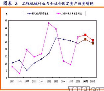 由于经济发展相对于宏观调控有一定滞后,预计08年固定资产投资将继续维持较高增长速度,但增速有所下降,相应地工程机械行业的增长将比07年有所下降,我们预计08年工程机械行业的销售收入约为22%左右,比07年的30%下降8个百分点左右。