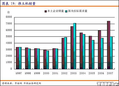 推土机是铲土运输机械中技术含量较高,工作环境较为恶劣,而应用范围较为狭窄的品种,我国推土机与世界范围内推土机销量常年稳定增长,增速略低于装载机。我国推土机产品发展较为充分,国内市场基本为国产品牌所占领,并有大量出口,07年外贸顺差1.8亿美元,我国目前在中型、大型类推土机已经达到国际先进水平,相对国外产品有较高性价比;特大型推土机还不能生产,严重依赖进口;小型推土机的质量、性能、稳定性与国外产品有较大差距,也需要进口。我国推土机市场出口空间较为广阔,拥有较大的对外扩展空间。