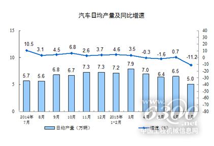2015年7月份,规模以上工业增加值同比实际增长6.0%(以下增加值增速均为扣除价格因素的实际增长率),比6月份回落0.8个百分点。从环比看,7月份,规模以上工业增加值比上月增长0.32%。1-7月份,规模以上工业增加值同比增长6.3%。