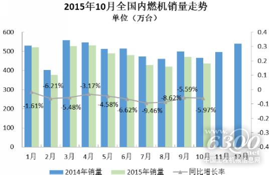 根据中国内燃机工业协会《中国内燃机工业销售月报》重点企业数据显示,2015年10月完成内燃机销量 436.82万台,环比下降7.05%,同比下降5.97%;1-10月销量累计完成4693.23万台,同比累计下降5.01%;10月完成18224.35万千瓦,环比增长6.24%,同比增长7.66%,1-10月累计完成171509.8万千瓦,同比累计增长2.08%。乘用车市场迎来全年黄金销售期,累计销量远好于行业平均水平,同比累计增长4.61%;受国2升国3影响,柴油机市场10月的销量明显不如上月,同比累计降幅维持在14.51%。