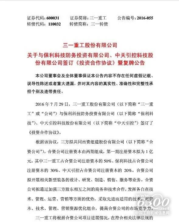7月29日晚间,三一重工发布公告,公司与保利科技防务投资有限公司(以下简称“保利科技”)、中天引控科技股份有限公司(以下简称“中天引控”)签订了《投资合作协议》。