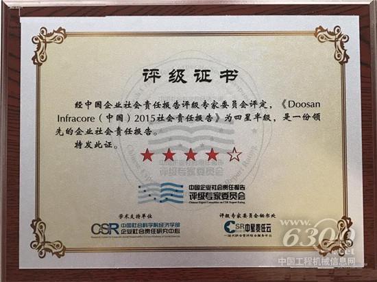 近日,斗山工程机械参加由中国社会科学研究院企业责任研究中心指导、中国社会责任百人论坛主办的“中国社会责任百人论坛——第五届分享责任年会”,荣获2016年度“责任产品奖”证书以及4星半级的报告初级奖牌。