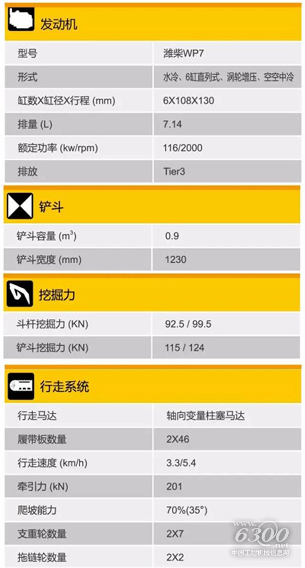 4.结构件:动臂、斗杆均采用箱体结构;铲斗斗容0.9立方米;加强型回转平台;履带架采用X型结构及锻造式回转支承座。