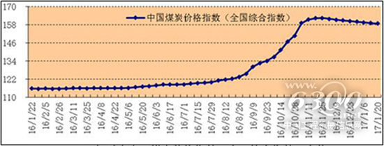 中国煤炭价格指数,引用自国家煤炭工业网。从图中可见煤炭价格在16年9月份后大幅上扬,在17年1月份时出现回落。
