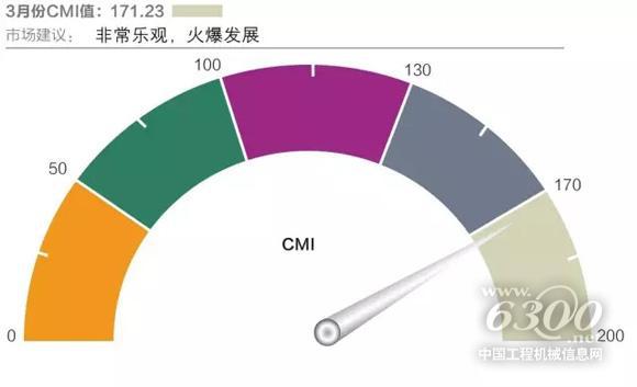 2017年3月份中国工程机械市场指数即CMI为171.23,同比增长25.66%,环比增加57.66%(依据CMI判断标准,170<CMI≤200,非常乐观,火爆发展)。