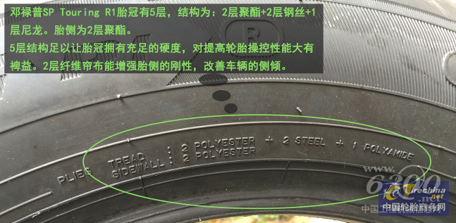 从图片中可见,邓禄普SP TOURING R1的胎冠有5层,结构为2层纤维帘布+2层钢丝+1层尼龙,胎侧则是2层聚酯纤维帘布。5层结构足以让胎冠拥有充足的硬度,对提高轮胎操控性能大有裨益。2层纤维帘布能增强胎侧的刚性,改善车辆的侧倾。