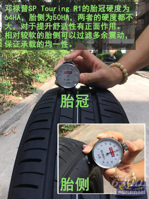 指针式邵氏A型硬度计的正式测量结果证实了我们的感觉——胎冠硬度为64HA,而胎侧硬度只有50HA。