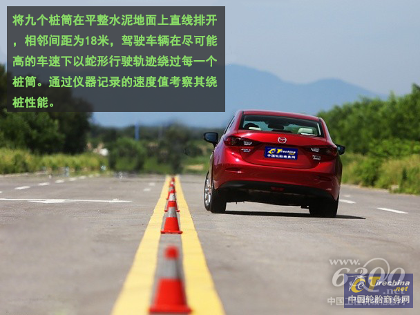 一般而言,极限绕桩的表现主要取决于整车的性能,但是轮胎作为汽车脚下的“运动鞋”,对汽车绕桩的能力也起到十分关键的作用。在本项测试中,我们将九个桩筒在平整水泥地面上直线排开,相邻间距为18米,驾驶车辆在尽可能高的车速下以蛇形行驶轨迹绕过每一个桩筒。通过仪器记录的速度值考察其绕桩性能。