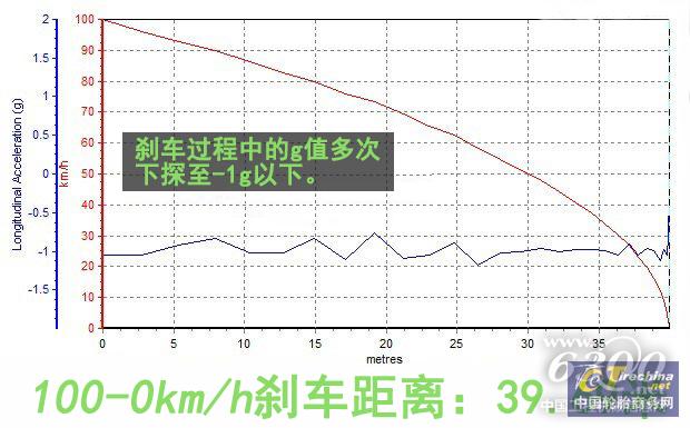 结果显示,从开始踩刹车算起,车辆又继续向前行进了39.69米才完全停下。观察刹车过程中的g值变化,可见其多次下探至-1g以下。考虑到这是从100km/h到0的制动,不到40米的制动距离已经是十分地抢眼,充分显示该款轮胎优秀的制动性能。