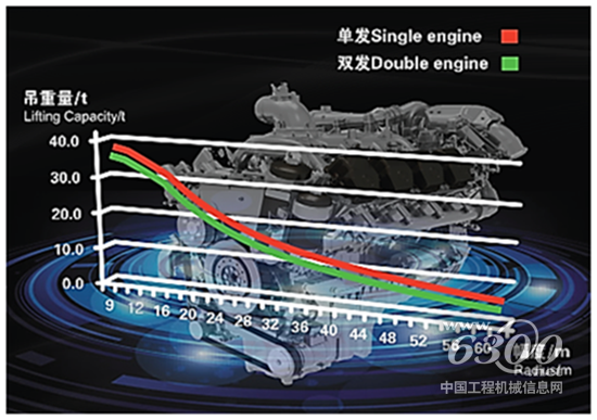 单发动机系统,整车共用一台发动机,即将底盘动力通过传动轴传递至上车,结构简单,可靠性高,故障率更低。XCA450采用G一代单发动机传动技术,整机降重约800kg,节约的重量被合理的分配到吊臂等关键结构件上,作业性能提升5%