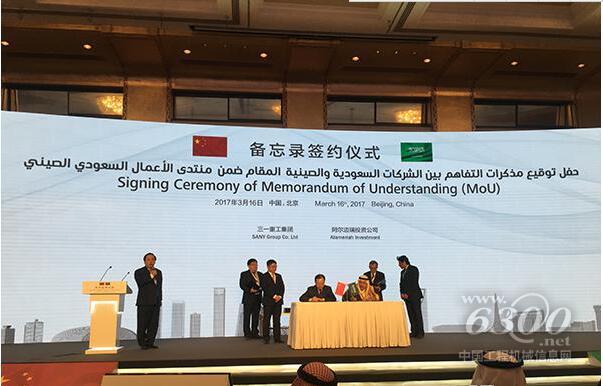 3月16日,在沙特国王萨勒曼的见证下,三一与阿尔迈瑞投资公司在当天的中沙投资论坛上,签署合作备忘录,双方将从2017年起分期建设5000至50000套的住宅房屋。三一集团总裁唐修国代表公司签约。第二天下午,阿尔迈瑞投资公司前往三一北京产业园,双方对即将合作的住宅房屋项目进行了进一步沟通。
