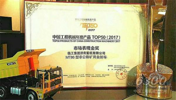 临工集团济南重机有限公司(以下简称:临工重机)生产的MT86非公路矿用自卸车首次参加TOP50评选活动,并一举斩获 “市场表现金奖”的殊荣。这是中国矿用车行业第一次也是本年度唯一获奖的产品。