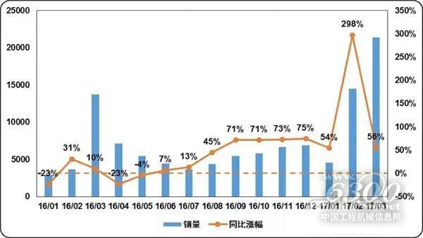 2017年第一季度挖掘机械市场继续保持爆发式增长势头,第一季度纳入挖掘机械分会统计的26家主机生产企业共销售不同型号和规格的挖掘机械产品40468台,同比增长98.9%。自2016年8月以来行业已连续8个月高位运行,反弹趋势显著。(注:自2017年1月起,上海彭浦机器厂不再进行挖掘机械销售数据申报,2017年1-3月纳入中国挖掘机械行业统计的企业数量为26家。)