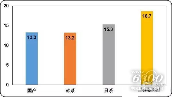 挖掘机械销售总吨位也是衡量行业发展的重要指标之一,从销售总吨位看,市场格局展示出不同的特点,欧美品牌由于在大挖、中挖的市场占有率更高,其在以吨位为衡量标准的市场占有率更高,国产和韩系品牌市场占有率则有所下降。根据挖掘机械分会统计结果,2017年第一季度不同品牌销售挖掘机械平均吨位见下图,欧美品牌单台平均吨位为18.7吨(总销量:7258台,总吨位135606吨);日系品牌单台平均吨位为15.3吨(总销量:8527台,总吨位130604吨);国产品牌单台平均吨位为13.3吨(总销量:20252台,总吨位268880吨);韩系品牌单台平均吨位为13.2吨(总销量:4431台,总吨位58465吨),欧美企业的产品平均吨位明显高于其他企业。