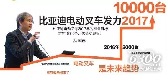2016年,比亚迪叉车实现了3000台的销量,随着市场对电动叉车接受度的提高,比亚迪叉车2017年的销售目标定在10000台。在2017年比亚迪商务年会上,比亚迪叉车事业部总经理毕国忠信心满满,他表示这个销售目标对于公司来说没有太大压力。