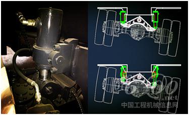 下车架工作平衡油缸由市场上各家普遍采用的固定式改为了摆动铰轴式,改善了在恶劣环境下的使用故障和增加工作稳定性。