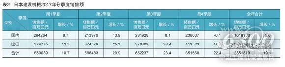 2017年,日本建设机械销售额大幅回升。2017年第1季度,日本建设机械销售额为6590亿日元,比2016年同期的5953亿日元增长10.7%。第2季度为5885亿日元,比2016年同期的4838亿日元增长20.9%。上半年合计为12475亿日元,比2016年上半年的10821亿日元增长15.3%。第3季度的销售额为6522亿日元,比2016年同期的5285亿日元增长23.4%。第4季度的销售额为6516亿日元,比2016年同期的5322亿日元增长22.4%。2017年全年4个季度销售额的同比增幅均为2位数。2017年日本建设机械销售额总计为25513亿日元,比2016年的21428亿日元大幅增长19.1%。