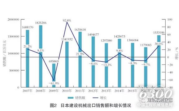 2007年和2008年,日本建设机械的销售额曾分别达到2.58万亿日元和2.59万亿日元,是近10年中最高的2年。但在世界金融危机和经济下滑的2009年锐减为1.16万亿日元,2010年后日本建设机械业状况有所回升,2011年起再度超过2万亿日元,2012年增长为2.25万亿日元。2013年日本建设机械销售额再度下降为2.23万亿日元,2014年又显著回升,年增长幅度超过9%,达到2.44万亿日元。2015年日本建设机械销售额合计为2.31万亿日元,比2014年减少5.3%,2016年为2.14万亿日元,比2015年减少7.4%。2015年和2016年日本建设机械销售额连续2年减少。