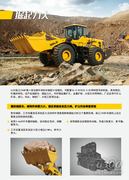 山东临工L968F装载机是“F系列”产品主打机型,是一款全新外观的高配长轴距节能型装载机。L968F采用山东临工新一代节能技术,配备三阶段电控发动机和变量控制转向系统,综合节能20%以上。该产品实现了大掘起力和高可靠性的完美结合,轴距长,掘起力与牵引力大,可铲掘金属矿石、金属矿粉、大型石材等物料,为矿山码头等重工况量身定制。