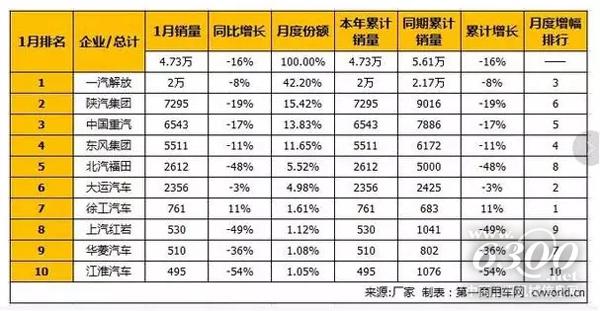 上表可见,1月份牵引车市场同比下滑16%,具体到1月销量前十企业来看1增9降,和市场的趋势高度吻合,仅徐工汽车一家企业实现增长。