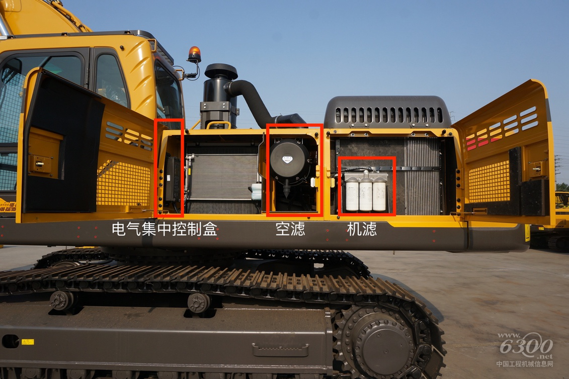 图为:左机罩集中布置空滤、机滤、电气集中控制盒