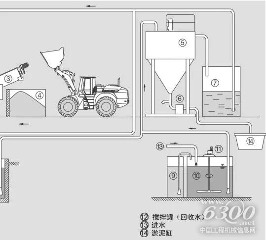 将砂石和水灰一次分离开来,分离后的砂石可重复使用,剩余的含有水泥的水流入水池,带有搅拌器的水池可以使回收水保持悬浮状态,回收水可返回搅拌站重新用于混凝土的生产。