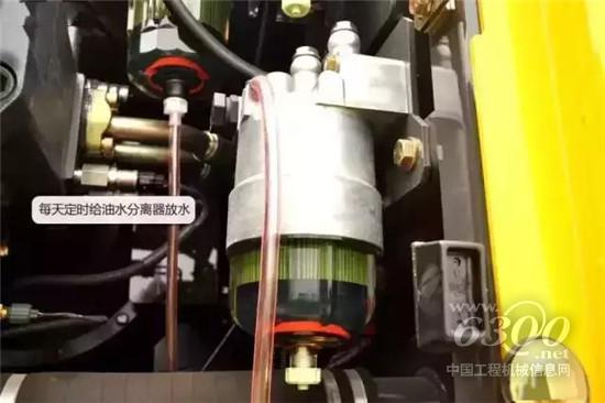 一般的油水分离器下面都有一个透明的塑料材质的积水杯,在使用油水分离器的时候一定要注意及时放水,积水太多油水分离器也就起不到油水分离的作用了。尤其在挖掘机加满燃油后,更需要进行排水。一般油水分离器处有燃油开关,此时带上手套,关闭燃油开关,打开排水口后拧开燃油开关,将积水杯内的水排干为止。这个过程看似简单却很容易被忽略。