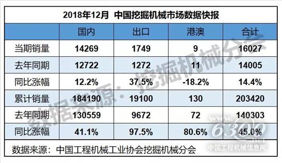 这是一份令人肾上腺飙升的数据:根据中国工程机械工业协会挖掘机械分会行业统计,2018年1—12月纳入统计的25家主机制造企业,共计销售各类挖掘机械产品203420台,同比涨幅45.0%。国内市场销量(统计范畴不含港澳台)184190台,同比涨幅41.1%。出口销量19100台,同比涨幅97.5%。