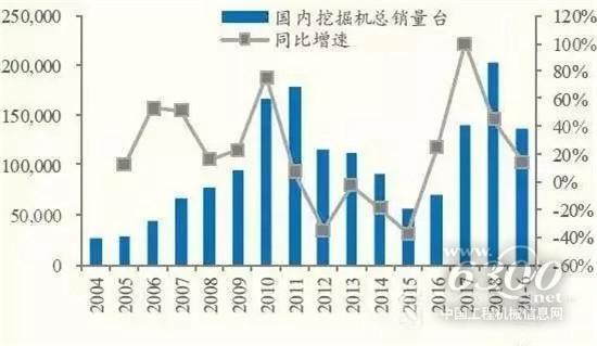 2018年全年挖机销量20.3万台,同比涨幅45.0%。国内市场销量(不含港澳台)18.4万台,同比涨幅41.1%。出口销量1.9万台,同比涨幅97.5%。