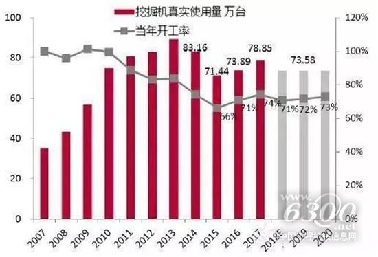 2015年是挖掘机真实使用量的一个低谷,真实使用量只有71.44万台,开工率也只有66%,均创下2010年以来最低值。