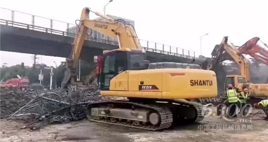 事故发生后不久,山推江苏代理公司紧急调运数台设备抵达事故现场,连夜开展救援工作,山推参与救援的SE215挖掘机为中型吨位产品,动力强劲,动作协调性好,配装的液压剪工作装置,具有强大的剪切力,可以快速剪碎混凝土提取废钢筋,在拆除和回收方面性能优越,可以大大提高救援工作效率;山推参与救援的推土机则将现场废弃物进行清理推移,最后由铲车运离现场。