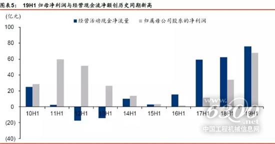 2019上半年,三一实现营业收入433.86亿元/+54.3%,归母净利润67.48亿元/+99.1%。19H1盈利与现金流均为历史同期最高水平。