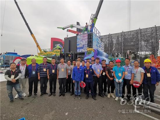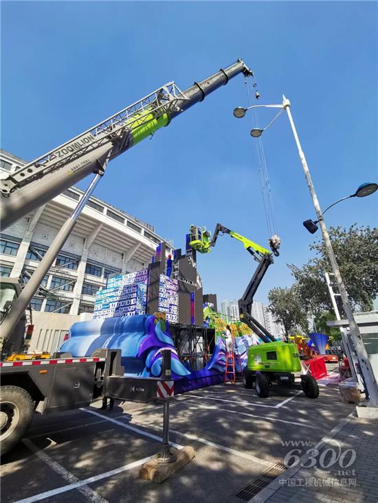 ▲湖南彩车转场工人体育馆后正在进行转运组装,中联极光绿产品成为靓丽的风景线