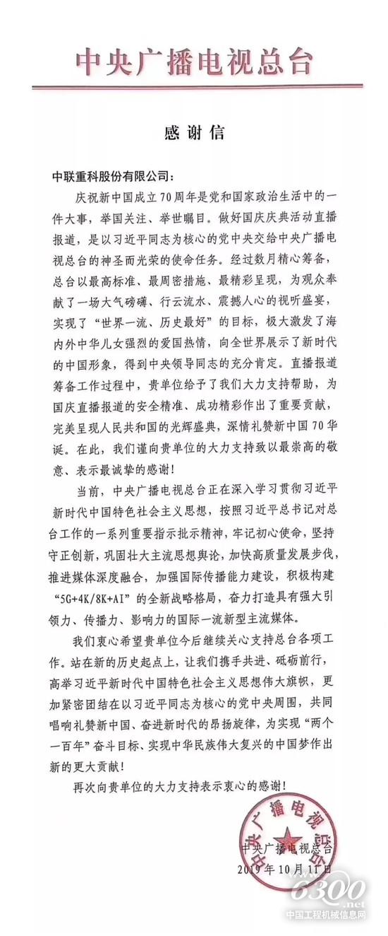 10月11日,中联重科收到了来自中央广播电视总台的感谢信。央视在信中对中联重科在此次庆典直播中所做出的贡献表示了真挚的感谢,对这些幕后英雄产品也给予了极大的肯定。