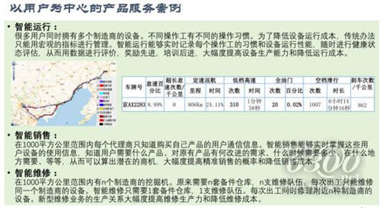 通过设备实际运行参数,比如一个物流车从哈尔滨到北京,老板手机一点,看到这个车已经出门了,大数据可以算出这个车拉出多少货,一看不是报上来的,是算出来的,才拉了20吨货,这个车可以拉40吨货,正好长春有20吨货,可以叫那个车到长春拐弯拉过来。