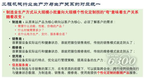 这些信息从哪儿来?要转变,制造商要从原来转变过来,销售商也要掌握设备实际运行和健康状态,把握销售商机。并不是设备卖出去后就结束了,要知道卖出去的设备每天在干什么,设备开工率高不高,高的话肯定有设备需求。
