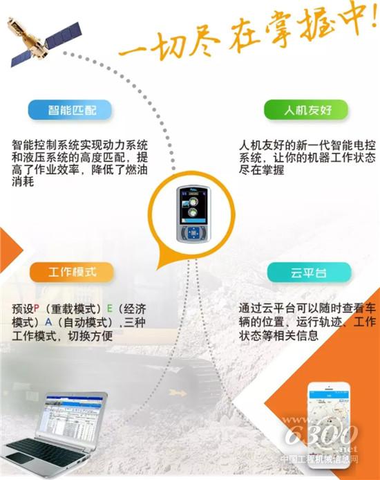 智能控制系统,实现动力系统和液压系统的高度匹配,提高了作业效率,降低了燃油消耗人机友好的新一代智能电控系统,让你的机器工作状态尽在掌握。通过云平台可以随时查看车辆的位置、运行轨迹、工作状态等相关信息。