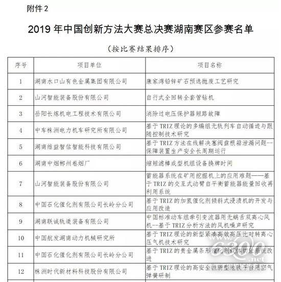 2019年中国创新方法大赛湖南赛区决赛由湖南省科协、湖南省科技厅共同主办,湖南省科学技术咨询中心、湖南省农村科技发展中心、湖南省技术创新方法研究会、湖南省企业科协联合会承办。比赛吸引了来自山河智能、华菱涟钢、中车株洲电力机车研究所、中国航发湖南动力机械研究所、水口山有色金属公司、中石化长炼、岳阳长炼机电工程技术有限公司等多家知名企业参与。