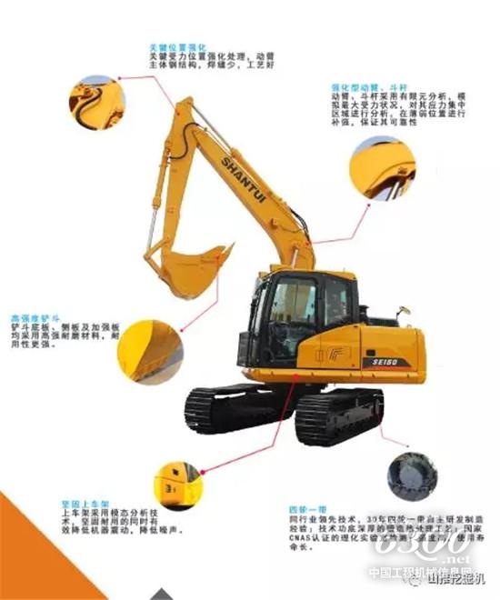 全面优化的工作装置,动臂斗杆轴座铸件化,强度高,耐磨性好,使用寿命长双边支撑的支重轮代替托链轮,配置单侧两个导轨器,X架加强,适应恶劣工