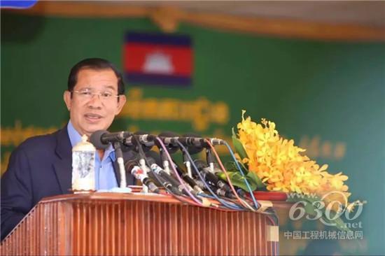 上图:柬埔寨王国首相洪森在开工仪式上致辞并开动设备,亲手启动项目建设。