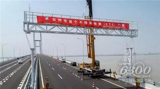 台州湾跨海大桥上,一台ETC龙门架被组装完成