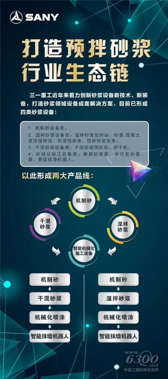 随着行业产业转型、环保升级、资源紧缺等挑战,三一重工近几年着力于打造预拌砂浆行业生态链,不断创新砂浆设备新技术、新装备,打造砂浆领域设备成套解决方案,目前已形成四类砂浆设备,包含:机制砂设备类、湿拌砂浆设备类、干混砂浆设备类、智能机械化施工设备类。