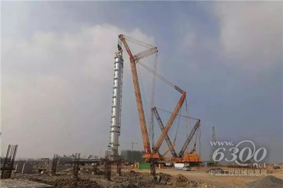 徐工XGC88000——4000吨履带起重机与1250吨履带起重机双机溜尾,主吊车4000吨履带起重机采用102主臂+33米固定副臂工况,就位工作半径34米。成功将直径6.804米的乙烯2号丙烯塔塔体安装就位。起竖安装高度达到108.6米,主吊起重重量达到了1435吨,充分彰显大国重器之威武雄姿。