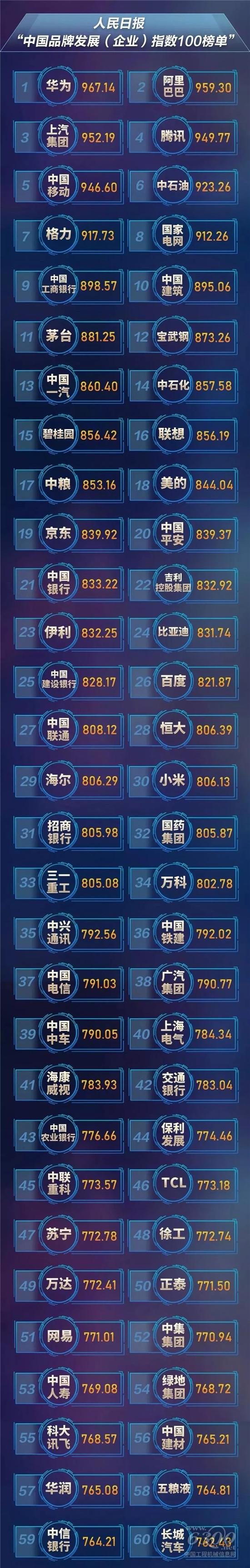 12月18日,人民日报权威发布“中国品牌发展指数100榜单”。三一重工与华为、阿里、腾讯等知名品牌一道入围,是榜单中排名最高的工程机械企业。